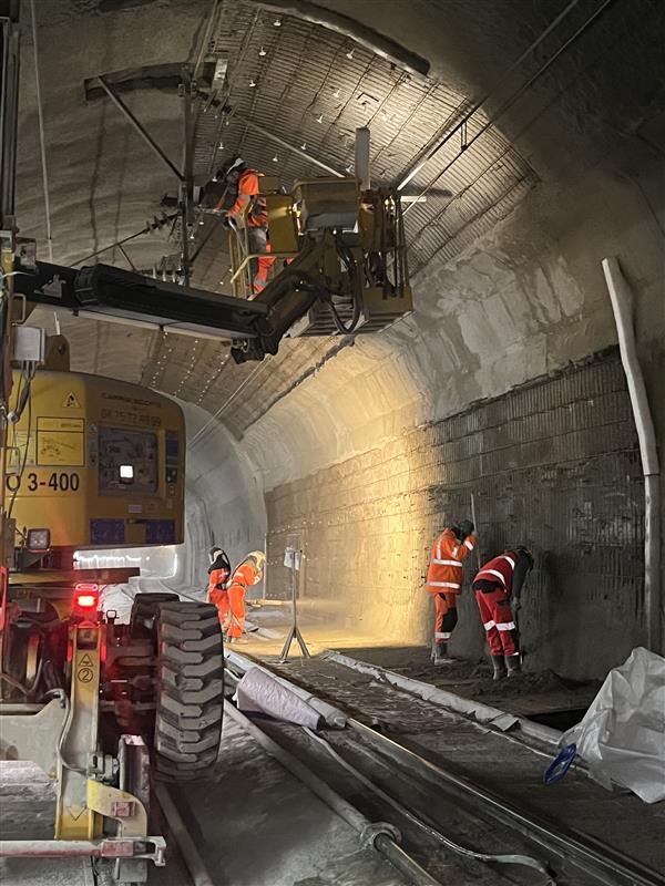 Construit en 1855, cet ouvrage nécessite une rénovation en profondeur afin de garantir sa pérennité. Spécificité du chantier : les opérations ont lieu en semaine, exclusivement de nuit, pendant les quelques heures où les circulations ferroviaires sont interrompues. Les travaux comprennent notamment le confortement de la voûte du tunnel à l’aide de béton projeté et des travaux sur les voies pour les repositionner, au millimètre près, à leur emplacement initial.