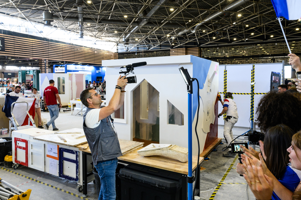 « Il n’est pas en avance mais il n’est pas en retard ». Dans le public, les soutiens d’Axel Laumont sont un peu tendus. À huit minutes de la fin, le compétiteur français en plâtrerie et construction sèche vient de fixer un moulage de tour Eiffel sur son module « free style ». Aura-t-il le temps de faire les finitions ?
