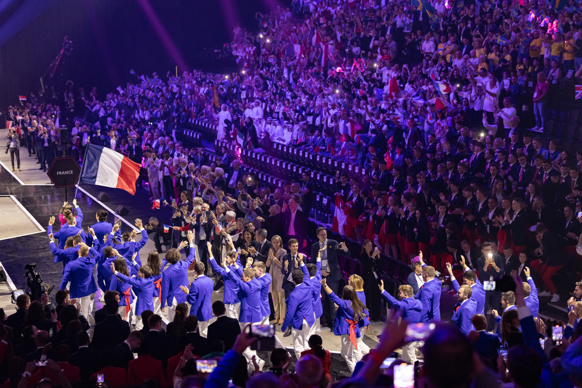 « Maintenant, c’est notre heure ! Nos compétiteurs ont envie de surfer sur la dynamique des Jeux Olympiques. Nous devons faire aussi bien que nos collègues sportifs ! ». Pour l’ancien handballeur international, Joël Abati, préparateur physique et mental de l’Équipe de France des métiers, la cérémonie d’ouverture, mardi soir au LDLC Arena de Lyon-Décines, avait un parfum olympique. Il en était de même pour les quelques 12 500 supporters venus encourager les 1 500 compétiteurs de moins de 23 ans venus de 65 pays et régions ! Une à une, les différentes équipes ont été appelées et ont défilé fièrement avec leur drapeau pour la parade des nations. « Tous ces jeunes avaient envie de montrer leur pays et de donner un peu d’émotion à chacun d’entre nous. La salle entière a été portée par cette joie de vivre », confie Christelle Rozier, administratrice du CCCA-BTP, aux premières loges de la cérémonie. Cette joie et cet enthousiasme collectifs se sont ressentis lors de l’arrivée des Bleus, ovationnés par le public en fin de parade des nations. Avec 63 compétiteurs, issus de 11 régions, l’Équipe de France des métiers est gonflée à bloc !